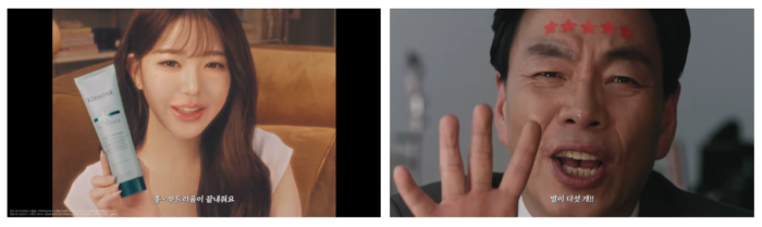 좀 더 세부적으로 들여다보면 익숙한 패러디 장면도 눈에 띄어요. 두피 케어 브랜드 케라스타즈 편에서는 장원영이 제품을 들고 ‘부드러움이 끝~내줘요’라는 멘트를 해요. 이는 농심 생생우동 광고의 “국물이 끝내줘요”를 패러디한 장면이죠. 또 다른 영상에는 장수돌침대의 ‘별이 다섯 개’ 장면을 차용한 부분도 등장하고요. 이렇듯 짐빔은 여러 브랜드와 레퍼런스를 넘나들며 예측하기 어려운 전개를 보여줬어요. 요즘은 이런 황당한 전개의 광고를 두고 ‘피곤할 때 꾸는 꿈 같다’라는 반응이 자주 달리는데요.