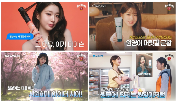 지난 3월 3일 짐빔은 새 캠페인의 티징 영상을 공개했어요. 티저는 짐빔 광고임에도 불구하고 장원영이 아이더 옷을 입고 등장하는 것부터 시작했죠. 명동역 전광판에는 짐빔을 포함한 9개의 브랜드 로고와 함께 찍은 장원영 사진이 걸리기도 했고요. 이것이 장원영 유니버스의 시작을 알리는 신호탄이었습니다. 바로 장원영이 모델인 8개의 브랜드(케라스타즈·데싱디바·어뮤즈·메디큐브 에이지알·아이더·우리은행·타미 진스)와 콜라보해 <함께 즐길 짐빔 됐어?> 시리즈를 선보인 것인데요.