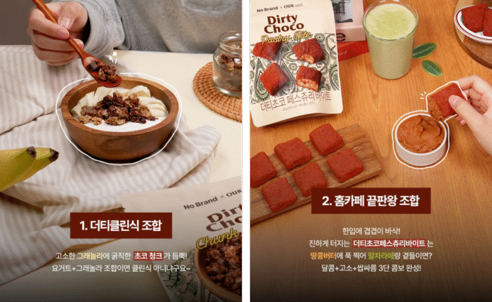 협업 제품은 아우어베이커리의 시그니처 메뉴인 ‘더티초코’를 베이스로 초콜릿, 그래놀라, 페스츄리 등으로 재해석한 5종 구성으로 선보였어요. 협업 과정에서 여러 차례 샘플링을 거쳐 양사 모두가 만족할 만한 맛을 찾아냈다는 점도 강조됐고요. 또한 아우어베이커리의 페이즐리 패턴을 패키지 디자인에 적용해 비주얼 완성도를 높인 점도 눈에 띕니다. 노브랜드가 단순한 PB 브랜드를 넘어 감각 있는 이미지로 확장하고자 했다는 점이 느껴졌어요.