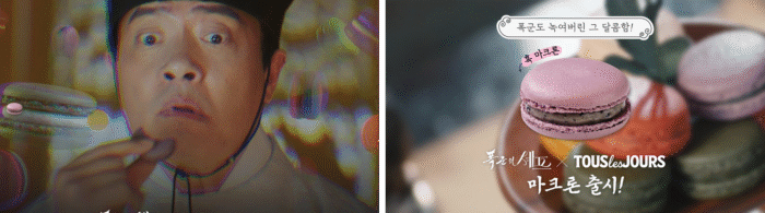 뚜레쥬르는 이 마카롱을 실제 제품으로 출시하며 큰 관심을 모았습니다. 사실 흑임자 마카롱 자체는 이미 많은 베이커리에서 쉽게 접할 수 있는 제품이지만, 여기에 <폭군의 셰프>라는 서사를 입히면서 ‘드라마 속 한 장면’으로 탈바꿈하게 된 거예요. 드라마 팬들의 감정적 몰입과 팬심을 자극하는 데 효과적이었죠.