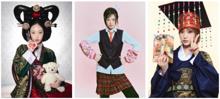 키키는 힙하고 당당한 ‘젠지미(Gen Z美)’ 그룹을 지향하고 있어요. 특히 최근에는 2000년대 유행한 벨벳 트레이닝복을 무대 의상으로 선보이고, 그 시절 화상 채팅 서비스인 하두리 감성의 뮤직비디오를 공개하며 Y2K 콘셉트를 한껏 살린 컴백으로 화제가 되었는데요. 이어 설을 맞아 2000년대 연재 만화이자 드라마 <궁>을 패러디한 화보를 공개했습니다. <궁>은 전통 의상과 당시 시대 배경을 조화롭게 담은 미감으로 지금까지도 호평받는 작품이에요. 이번 화보도 원작 요소를 그대로 차용해 폴더폰과 한복, 당시 스타일의 교복과 팔토시를 매치하는 등 전통적인 요소와 Y2K 무드를 동시에 살린 것이 돋보였어요.
