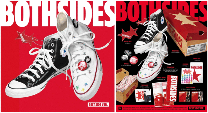 먼저 눈에 띄는 점은 컨버스화가 앨범의 중심 요소로 설계됐다는 거예요. 패키지는 신발 박스 형태에, 한 쌍의 컨버스화와 컨버스화를 커스텀할 수 있는 스티커와 뱃지가 포함돼 있어요. 대신 일반적인 앨범의 기본 요소로 여겨지는 CD는 과감히 제외됐죠. 음원은 신발에 달 수 있는 팬던트 형태의 NFC로 제공돼요. 서로 다른 색상의 컨버스화는 두 멤버를 상징합니다. 즉 각기 다른 매력을 지닌 둘이 유닛으로 모여 시너지를 낸다는 콘셉트를 강조하기 위해 신발 요소를 전면에 내세운 구성이에요.