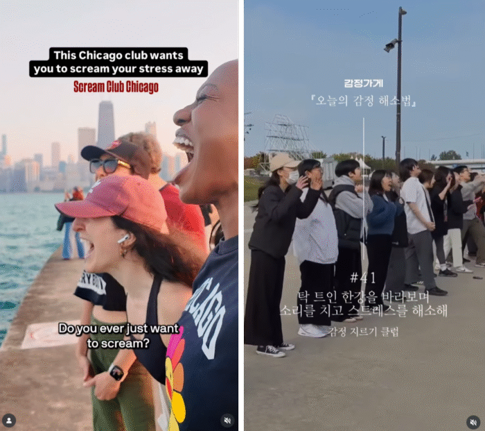 ‘감정 지르기 클럽’은 올해 미국 시카고에서 화제를 모았던 ‘스크림 클럽(Scream Club)’에서 영감을 얻은 캠페인이에요. 말 그대로 한 곳에 모인 사람들이 함께 소리를 지르며 그동안 쌓인 감정을 분출하는 커뮤니티 활동으로, 요가나 명상 같은 전통적인 웰니스 방식보다 직접적이고 즉각적인 해소법으로 주목받고 있어요.