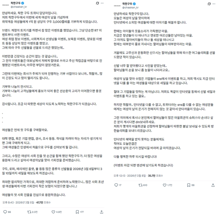 착한구두는 한 차례 고구마팜에서 특별한 엑스 마케팅 사례로 언급된 적이 있는데요. 소비자의 입장을 고려해서 그들이 필요할 만한 화제로 소통한 것이 핵심이었죠. 그리고 이제는 선한 영향력을 전하는 브랜드로 자리 잡았어요. 여성의 날을 맞아 취약 계층 여성에게 1억 원 상당의 구두를 기부하거나 SNS를 접하기 어려운 노인 계층의 사연을 받아 구두를 선물하는 등 구두를 매개로 다양한 활동을 이어나가는 중이고 이러한 소식은 모두 엑스 내에서 꾸준히 바이럴 되고 있거든요.