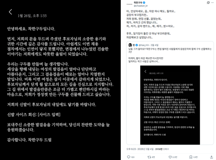 이는 한 취업 준비생이 착한구두 면접 탈락 이후 받은 문자를 엑스에 공개하면서 시작됐어요. “후보자님이 딛게 될 모든 순간을 지지한다”는 응원과 함께 구두를 선물하고 싶다는 내용이었는데요. 게시자는 “문자를 받자마자 펑펑 울었다”라며 면접 과정에서 가장 인상적인 브랜드였다고 언급했죠. 이후 착한구두 공식 계정이 이를 인용하면서 해당 내용은 도합 7천 회 이상 공유됐고 기사로도 보도됐어요.