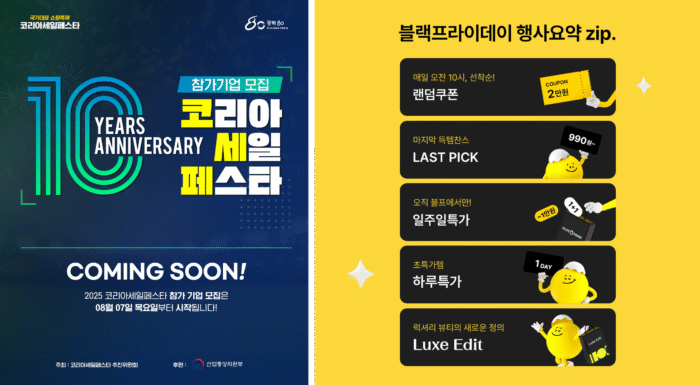 한국의 블랙 프라이데이, 대규모 쇼핑 기획전인 ‘코리아 세일 페스타’가 곧 열려요. 아직은 자세한 정보가 많지 않지만, 기존에는 11번가, 알리익스프레스, SSG닷컴 등 국내외 이커머스 플랫폼이 대거 참여해 왔는데요. 올해는 특별히 10주년을 맞이하여 내수 경제 활성화를 목표로 국내 중소기업·소상공인이 참여하는 쇼핑 할인 행사인 ‘동행축제’와 통합해 진행될 예정입니다.