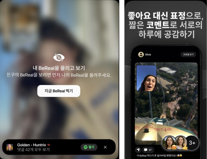 대부분의 소셜 미디어가 불특정 다수에게 나를 노출하는 구조라면 비리얼은 좀 더 좁고 깊은 관계에 집중합니다. 친구가 아닌 유저의 게시물은 볼 수 없고 앱 내 친구들의 소식만 주고받을 수 있거든요. 여기에 조건부 열람 시스템까지 더해집니다. 내 사진을 올리지 않으면 친구의 사진도 볼 수 없어요. 즉 함께 일상을 공유하는 것이 필수적이죠. 반응을 남기는 방식도 독특해요. 단순히 하트만 찍지 않고, 내 표정을 찍어 감정을 공유하는 리얼모지로 더 친밀한 표현이 가능해요. 친구의 꾸밈없는 일상을 보고 내 얼굴로 반응하며 더 느슨하지만 끈끈한 연결을 이어갈 수 있죠.