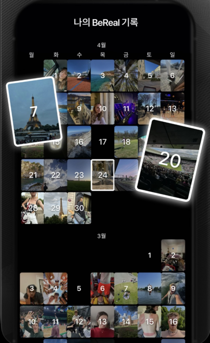 이렇게 올린 게시물은 다음 알림이 울리면 메인 피드에서 자연스럽게 내려가고 ‘나의 Bereal 기록’ 페이지에 달력 형태로 아카이브 됩니다. 이때 전체 공개로 전환해두지 않는 한, 다른 유저는 내가 과거에 올린 게시물들을 더 이상 확인할 수 없어요. 하지만 친구들이 남긴 유쾌한 반응과 댓글은 달력 안에 고스란히 저장되어 그날의 생생한 추억은 온전히 간직할 수 있죠. 과거 사진이 계속 노출된다는 압박이 없으니 좋아요 수나 타인의 시선에 얽매일 필요도 없습니다. 남에게 보여주기 위한 전시용 피드가 아니라 오롯이 내 진짜 일상을 간직하는 일기장으로 기능해 장기적이고 안정적인 앱 사용을 끌어내는 것이 가능해요.