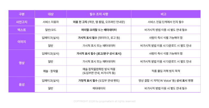 이미지는 ‘실제와 얼마나 비슷한가’에 따라 의무가 달라져요. 실제 인물이나 사물과 구분하기 어려운 딥페이크 수준이라면 반드시 사람이 즉시 인식할 수 있는 가시적인 표시(워터마크, 로고)를 적용해야 해요.