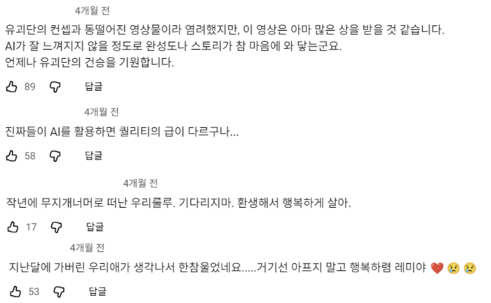 영상을 본 사람들의 반응은 어땠을까요? 반려동물을 떠나보낸 상실감을 덤덤하게 풀어낸 스토리에 많은 위로와 공감이 쏟아졌어요. 자신의 반려동물을 떠올리며 눈물을 흘리는 사람이 많았죠. 한편, 실제 같은 수준 높은 영상미가 100% AI로 제작된 것이라는 사실에 놀라움을 보이기도 했고요. 어떤 도구를 쓰느냐보다 그 안에 어떤 마음과 이야기를 담느냐가 중요하다는 사실을 다시 한번 확인시켜 준 셈이에요.