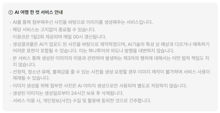 여기서 눈여겨볼 점은 바로 투명한 안내와 개인정보 보호예요. ‘생성 결과물은 AI가 업로드된 사진을 바탕으로 제작했습니다’라는 안내 문구를 통해 이 이미지가 실제가 아님을 명확히 밝히고 있죠. 또한 사용자가 가장 민감해할 수 있는 부분인 원본 사진에 대해서도 ‘생성을 위해서만 사용되며 별도로 저장되지 않습니다’, ‘결과물은 24시간 후 삭제됩니다’라고 구체적으로 안내하고 있는데요. 이는 단순히 법적 의무를 지키는 것을 넘어 소비자가 안심하고 AI 기술을 즐길 수 있도록 배려한 좋은 예시라고 할 수 있어요.
