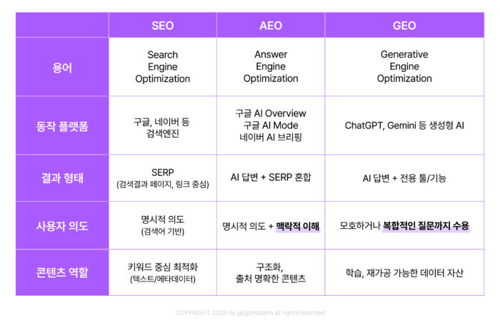 즉, GEO는 생성형 AI 서비스(ex. ChatGPT, Gemini)에서 독립된 UX로 작동하는 반면, AEO는 기존 검색 기능(구글, 네이버 등의 검색 포털)에 곁들여진 확장형에 가깝다.