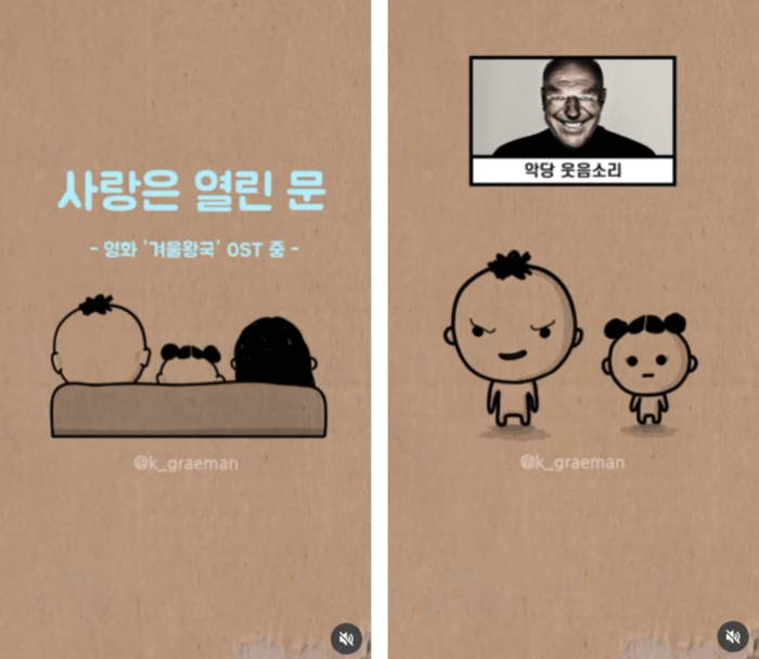 평범해서 더 소중한, 일상 속 가족 이야기를 자연스럽게 담아내는 릴스툰 유형이에요. 아이나 남편 등 실제 가족 간의 대화나 음성을 바탕으로 애니메이션을 제작해 보는 사람의 몰입감을 더욱 높여주죠. 친근하고 공감 가는 주제 덕분에 타깃 연령층이 넓고, 가전·살림·육아 등 폭넓은 브랜드와의 협업이 가능한 점도 특징이에요.