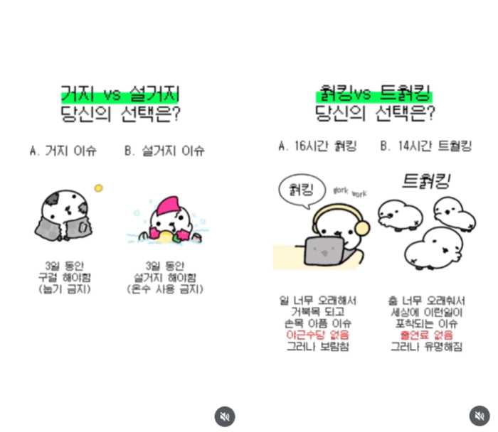 직장인 ‘뱁새’ 캐릭터가 주인공으로 등장하는 인스타툰 채널이에요. 공감형 직장인 콘텐츠는 정적인 인스타툰 형식으로, 어이없고 웃긴 콘텐츠는 주로 릴스 포맷으로 업로드해요. 예를 들어 ‘거지 vs 설거지’, ‘웕킹 vs 트웕킹’처럼 황당하지만 어떤 선택을 해야 할지 은근 고민하게 되는 주제로 하는 밸런스 게임 같은 것들이죠. 이를 릴스로 제작해 시청자들의 참여를 적극적으로 유도하고 있습니다.
