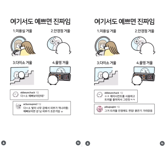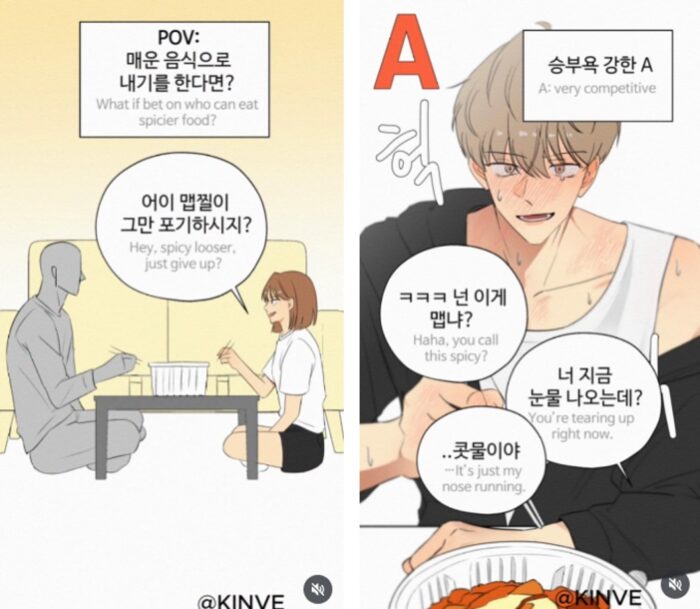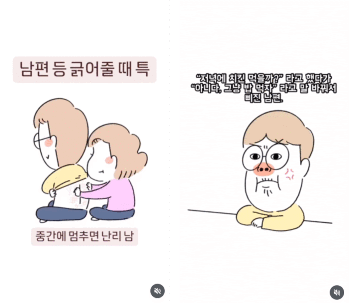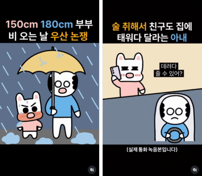 알콩달콩하지만 티격태격이 일상인 연인·부부의 이야기를 담아내는 유형이에요. 가족 계정과 마찬가지로 실제 커플의 대화나 음성을 활용해서 브이로그처럼 현실감과 몰입도를 높인 콘텐츠가 많아요. 특히 유행하는 커플 밈이나 챌린지를 활용한 릴스툰도 활발하기 때문에, 실제 커플들이 서로를 태그하며 댓글을 남기는 모습을 자주 볼 수 있어요.