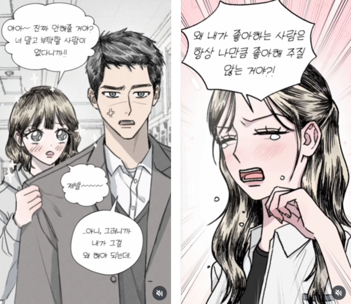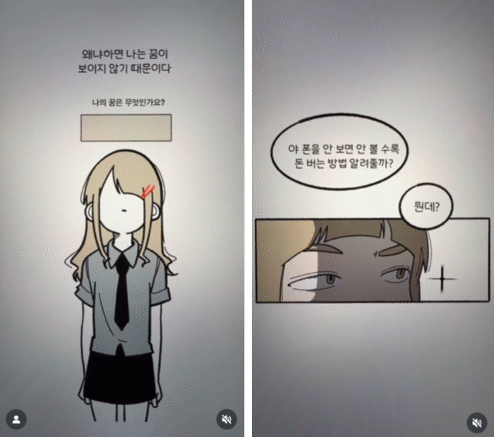 10대들의 공감과 설렘을 동시에 자극하는 학원물 릴스툰 유형이에요. 대부분 학교·카페·거리 등 일상적인 공간을 배경으로, 짝사랑·고백·우정 같은 서사를 다룹니다. 웹툰 컷처럼 연출된 화면과 찰떡같이 어울리는 BGM 덕분에, 마치 짧은 드라마를 보는 듯한 몰입감을 주죠. 특히 댓글창에는 “제발 웹툰으로 연재해 달라”는 반응이 많을 만큼 팬층의 애정이 높은 장르입니다.