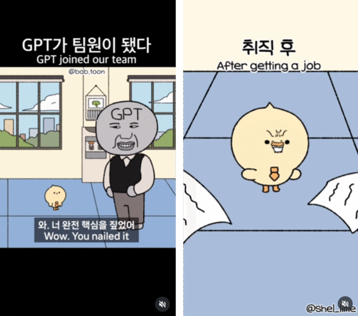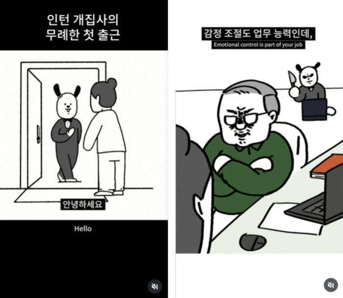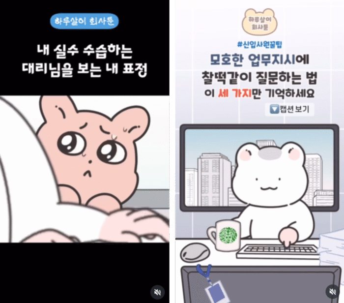 가상의 직장생활을 배경으로 한 ‘하루살이툰’을 연재하는 채널이에요. ‘AI 보이스’를 활용한 캐릭터 음성 기능까지 더해져, 콘텐츠 몰입도를 높이고 있어요. ‘내 실수 수습해 주는 대리님’처럼 직장 상황툰 뿐만 아니라 ‘신입사원 꿀팁’, ‘퇴사 전 꼭 해야 할 5가지’ 등 직장인들에게 유용한 꿀팁들도 자주 등장합니다.