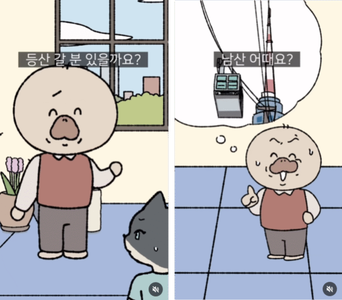 ‘서울시 남산곤돌라’ 신설 소식을 전하는 콘텐츠에서는, “주말에 남산 등산을 가자”는 대표님의 제안에 밥풀이가 온갖 핑계를 대며 거절하다가, “내년에 곤돌라가 생기면 그때 가자”는 스토리로 자연스럽게 캠페인을 녹여냈어요.