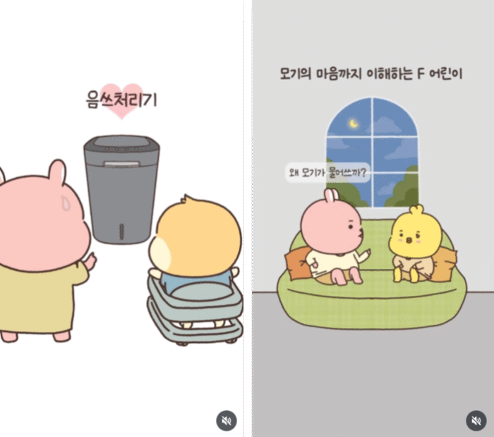 ‘슈슈(첫째, 딸)’와 ‘호두(둘째, 아들)’ 그리고 엄마 ‘지도리’의 실제 대화를 바탕으로 한 릴스툰이에요. 수많은 장난감보다도 음식물 처리기를 더 좋아한다던가, 자신을 문 모기의 마음까지 공감을 하는 등 어린 아이 특유의 순수한 매력이 봉주르라이프 채널에서는 고스란히 드러난답니다.