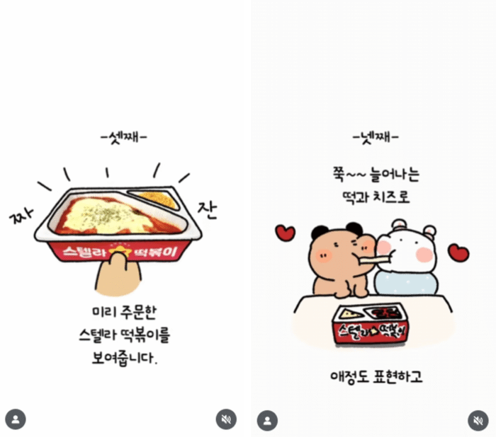 ‘우울한 내 짝꿍 행복하게 만드는 방법’이라는 주제의 콘텐츠에서는 이불에 돌돌 말린 순희를 식탁 앞에 앉혀 ‘스텔라 떡볶이‘를 먹이며 기분을 달래주는 모습을 보여줬습니다. 자연스럽게 브랜드의 제품을 노출하면서도 커플 간의 따뜻한 일상을 유쾌하게 담아냈어요.