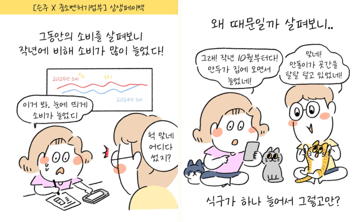 ‘중소벤처기업부’와의 협업 콘텐츠에서는 소비 지출에 따라 상생페이백 지급 대상이 될 수 있다는 메시지를 전달했어요. 반려묘 만두가 새 가족이 되면서 고양이 용품 구매가 잦아졌다는 상황을 활용해, 실생활 변화와 제도 정보를 자연스럽게 연결했답니다.