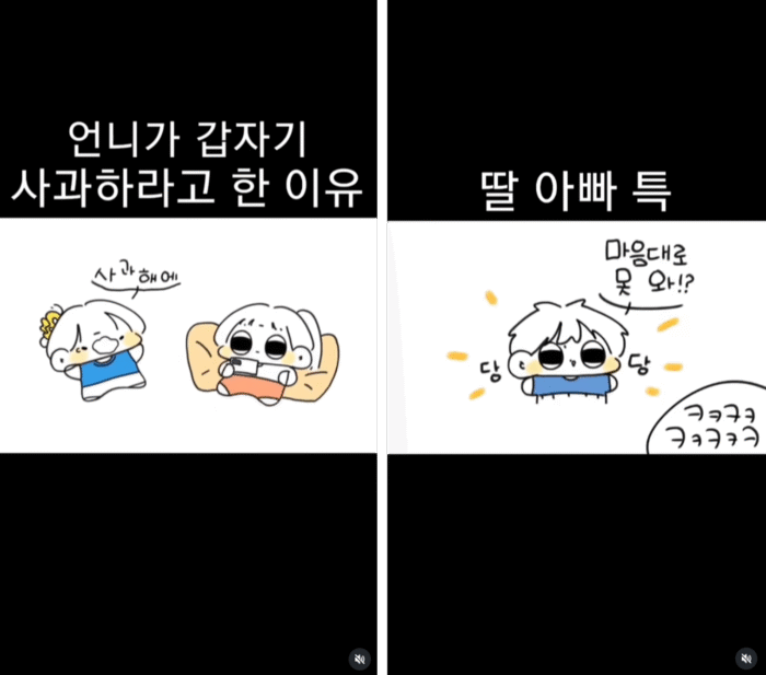 항상 티격태격하는 자매와 딸들을 무심한듯 사랑으로 대하는 아빠, 그리고 가끔 등장하는 엄마까지. 유쾌한 가족 일상을 담은 채널이에요. 첫째딸이 인스타툰 작가로 일러스트와 계정 운영을 맡고 있고, 특히 아빠가 등장하는 콘텐츠가 가장 높은 인기를 자랑해요. 딸들에게 귀여운 말투로 응수하는 아빠의 매력이 킬포인트!