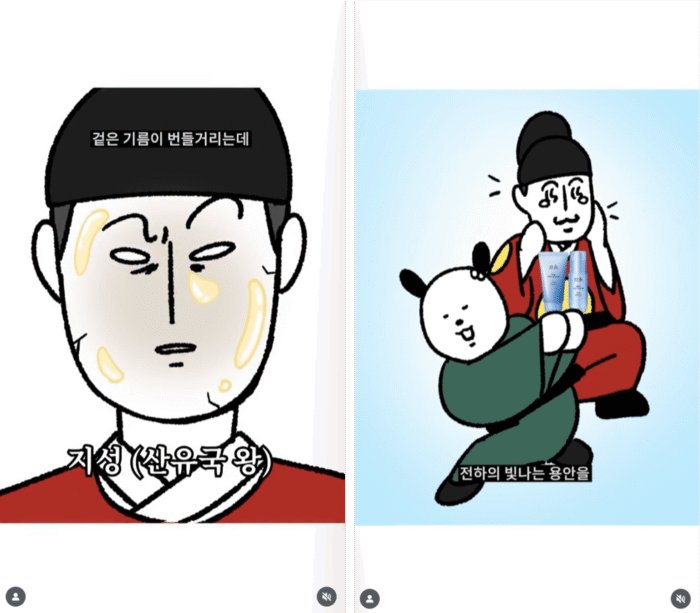 ‘한율 쑥히알 세럼·크림’ 광고에서는 두기가 예민한 ‘산유국 왕 지성’을 위해 전설의 세럼을 찾아 떠나는 모험 스토리를 애니메이션으로 구성했어요. 제품을 바른 왕 ‘지성’이 만족해 두기를 세자책봉한다는 황당한 결말까지, 유쾌하면서도 브랜드 메시지를 명확히 전달한 사례였습니다.