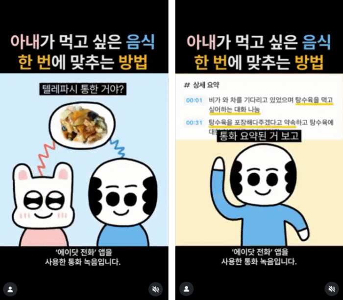 ‘SKT 에이닷 전화’ 광고에서는 실제 에이닷 앱을 통해 녹음한 커플 통화 내용을 바탕으로 콘텐츠를 제작했어요. “기억에 남는 통화를 기록하고 싶다”는 커플들의 니즈와 기능적 장점을 함께 전달하며, 타깃 유저에게 공감을 얻어냈습니다.